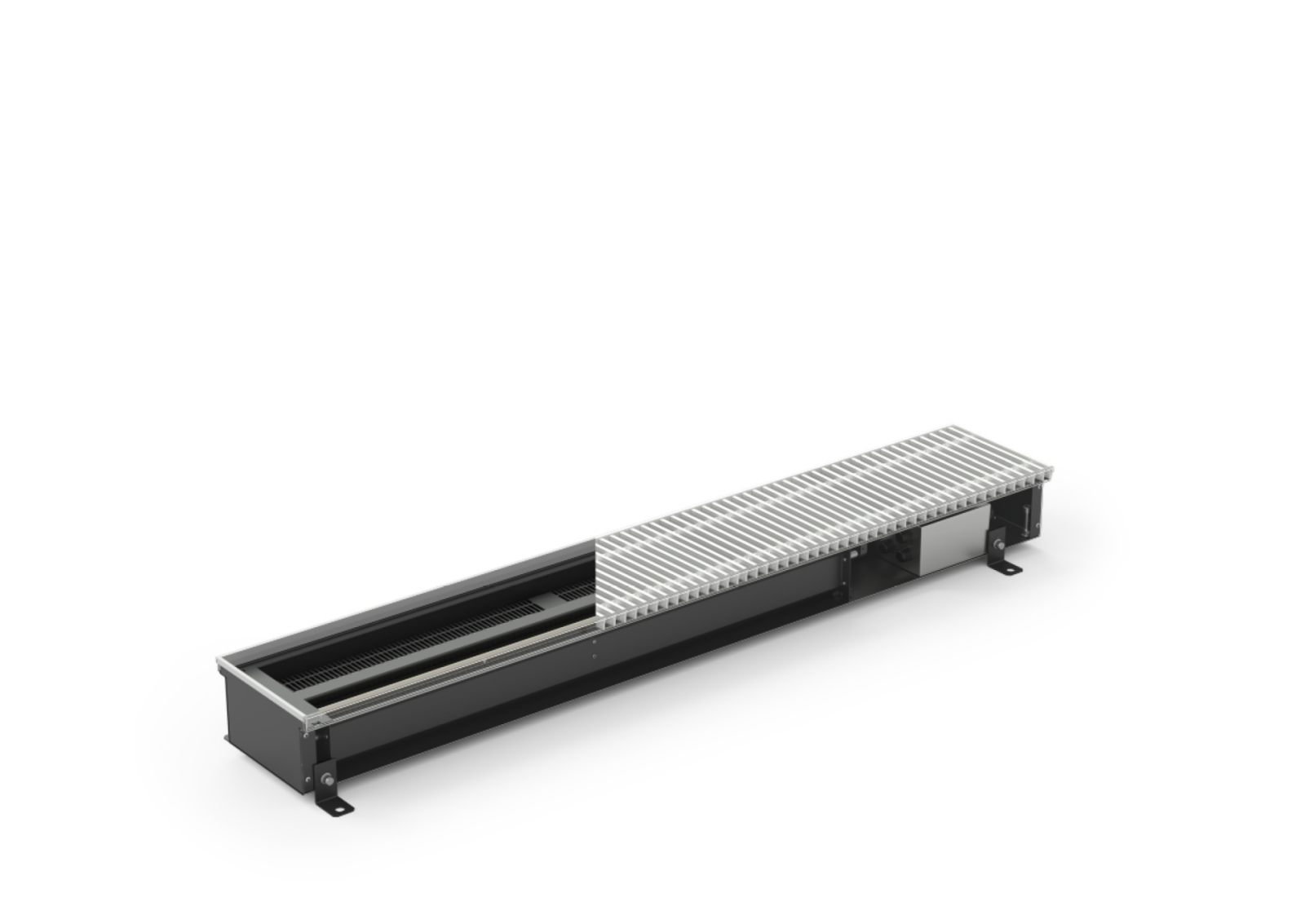 Convecteur de sol électriques KORAFLEX avec ventilateur, version Amper, longueur 120 cm, profondeur 11 cm, largeur 20 cm, peint en noir RAL 9005, cadre en U de couleur argent, sans bord abaissé, avec grille de recouvrement enroulable en aluminium – profil T et régulation 230 V AC.